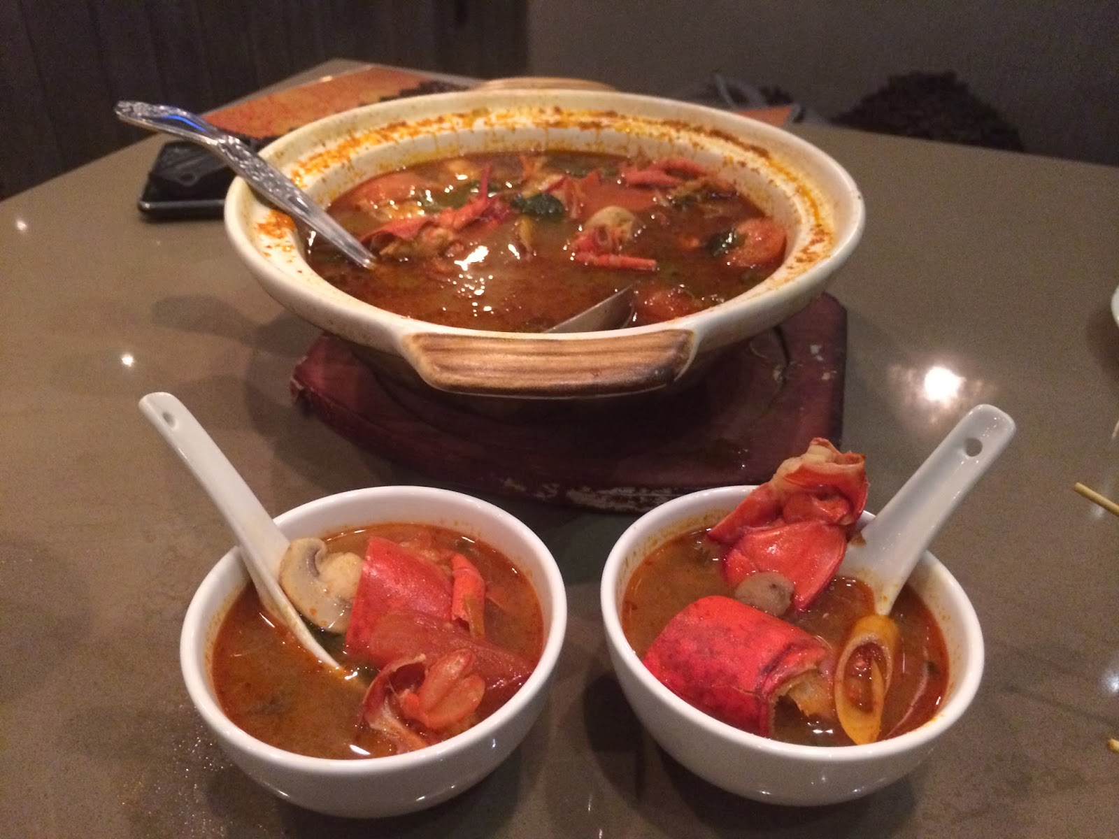 LOBSTER TUNG YAM KUNG, A DELICIOUS HOT AND SPICY SOUP SIMMERED WITH FRESH LOBSTER ($26.95).