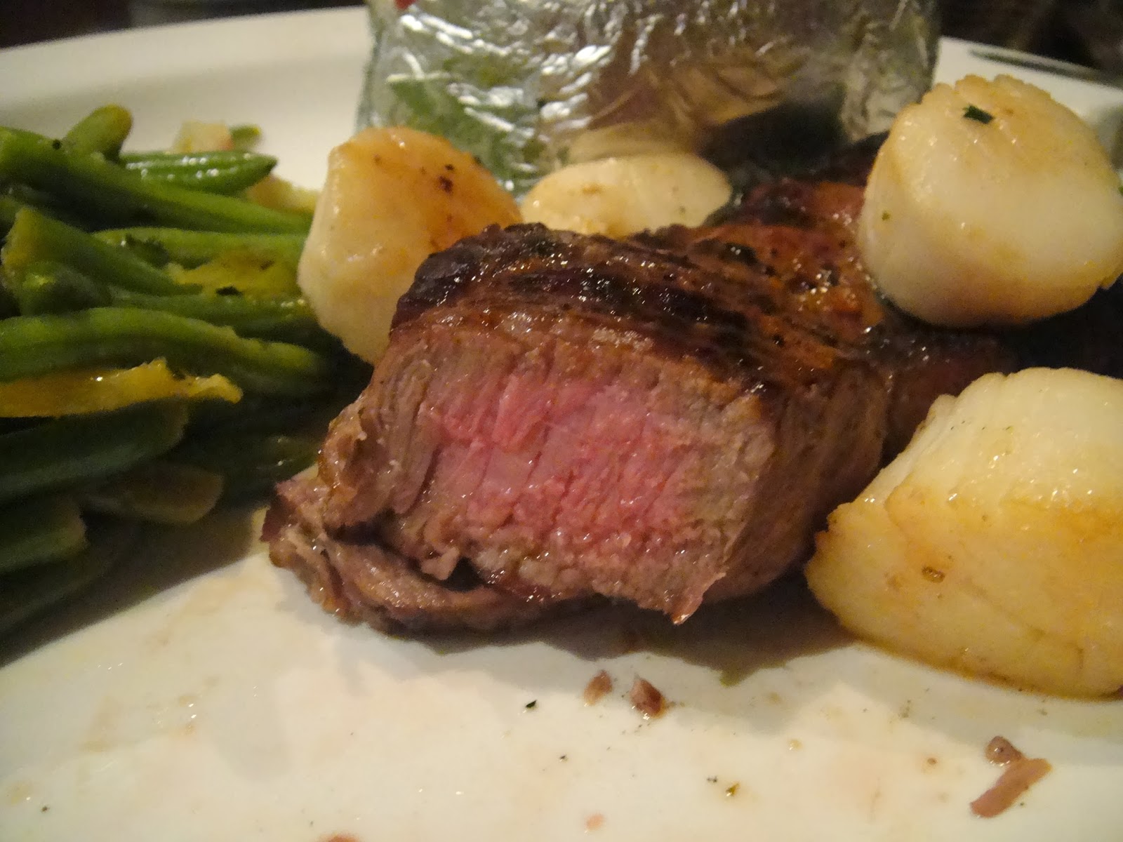 The steak is creeping up close to a medium than the requested medium rare and although extremely dry, does not taste too chewy. For the large sized scallops, the first couple tastes quite moist, tender as well as tasty. However, the scallops went downhill from there. The rest of the scallops have an unpleasant grainy sand as well as a salty milky taste, and should have been properly rinsed. It is pretty unfortunate considering the value! Moving to the side of vegetables, the green beans are sautéed and tossed in a light vinaigrette, not overcooked and tastes quite fresh.